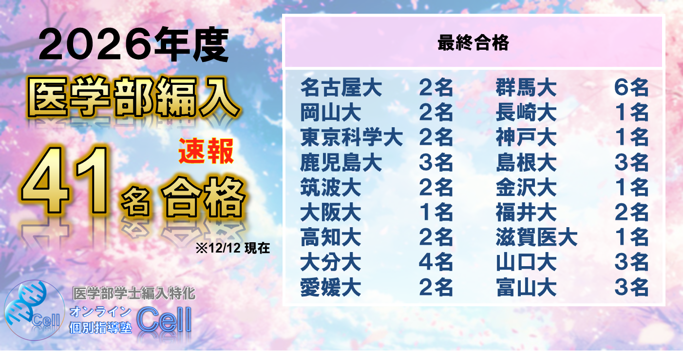 情報の少ない医学部編入試験において「とにかくあとは勉強するだけ」を作る医学部学士編入専門の個別指導塾です。
