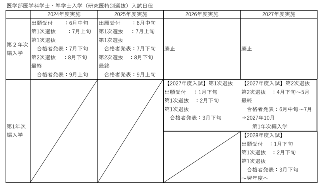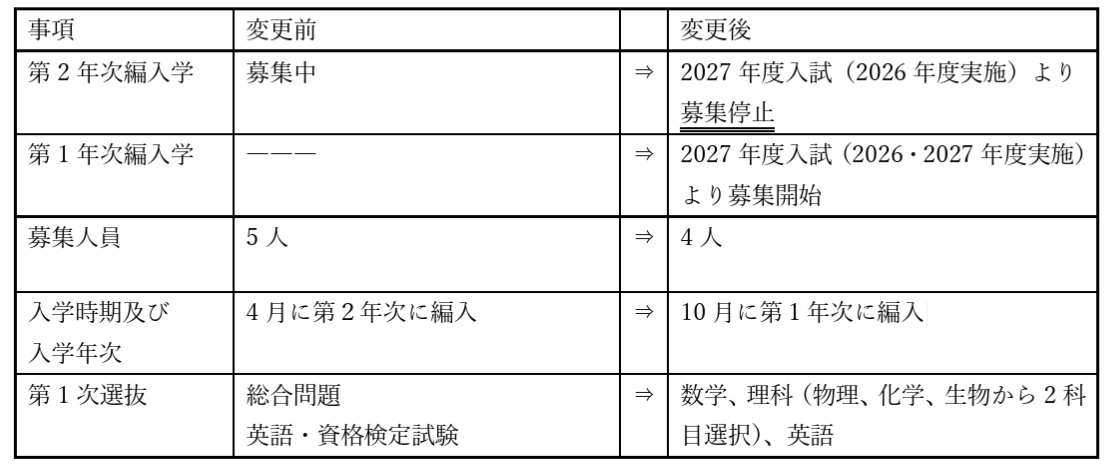 2027年度入学者選抜からは、下記のように1年次の10月への編入となり、定員も4名に減るので注意が必要。